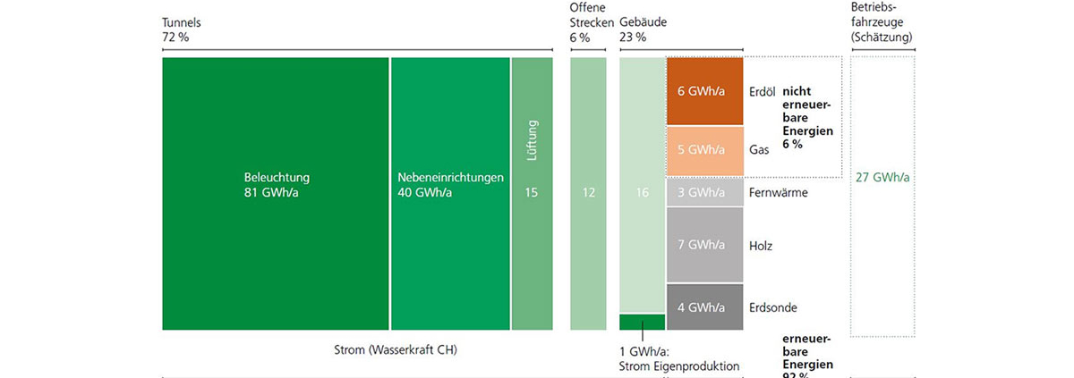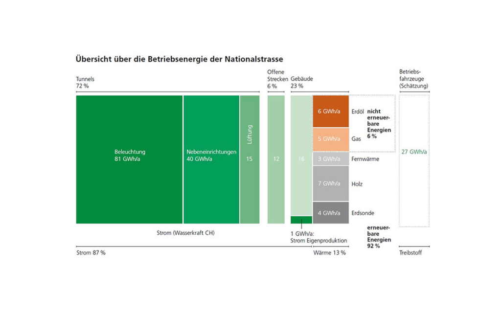 Das ASTRA deckt den gesamten Strombedarf aus erneuerbaren Energien. Den grössten Anteil daran hat die einheimische Wasserkraft. Für den Eigenbedarf produziert das ASTRA mit Photovoltaikanlagen rund eine GWh Strom. Dieser Anteil soll bis 2030 auf 35 GWh pro Jahr erhöht werden. Um dieses Ziel zu erreichen, sollen Dächer von Werkhöfen und Tunnelzentralen sowie Überdeckungen in Tunnelnähe mit Photovoltaikanlagen ausgestattet werden.