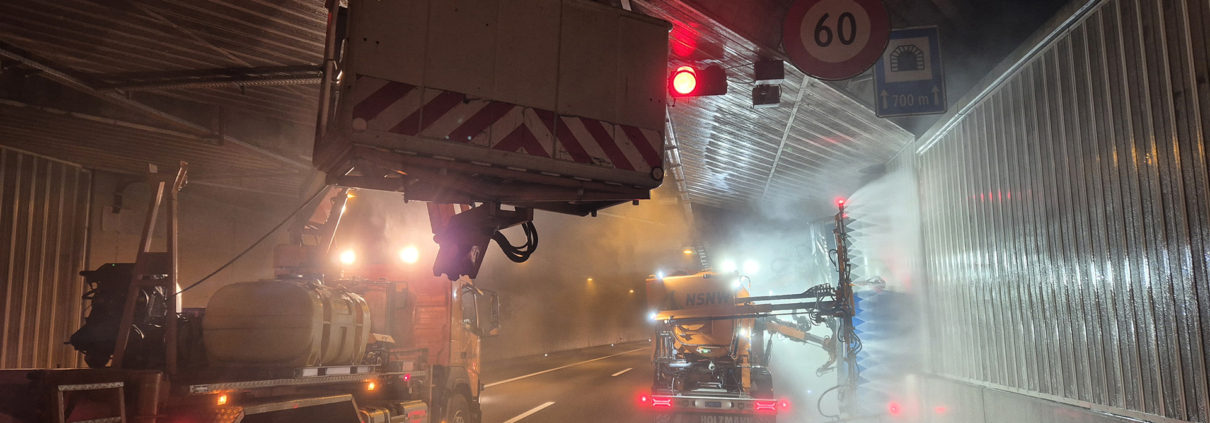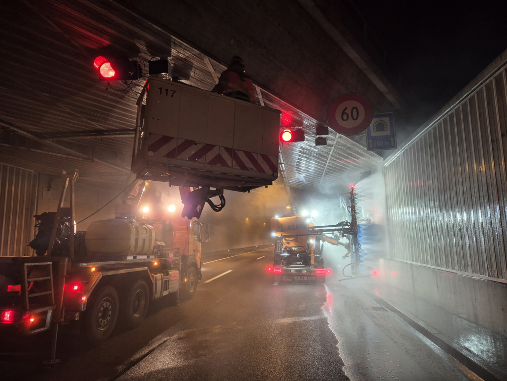 Einmal im Tunnel angekommen, wird deutlich, dass ein eingespieltes Team am Werk ist. Das rund 30-köpfige Team der NSNW funktioniert wie eine gut organisierte Ameisenkolonie. Alle Lastwagen, Reinigungsmaschinen und Begleitfahrzeuge sind im Nu an ihrem Ausgangspunkt und beginnen mit der Tunnelwäsche. Für einen Laien ist es schwierig, im Dunst der Gischt aller Putzmaschinen den Überblick zu behalten. Nicht so für «Benu». Er kennt seine Aufgabe und Handgriffe und die Tunnelsignale sind rasch und rechtzeitig wieder sauber – trotz anfänglicher Verspätung.