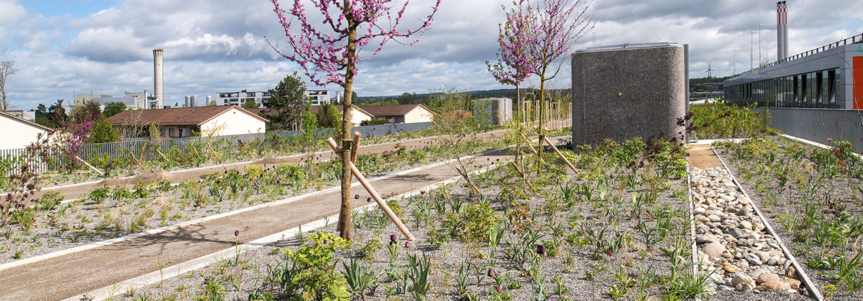 Afin d’atténuer le bruit routier à la hauteur de Schwamendingen (ZH), une tranchée couverte au-dessus de l’autoroute a vu le jour. Un parc est en train d’être aménagé sur cet ouvrage, dans le but de l’intégrer au mieux dans l’environnement urbain.